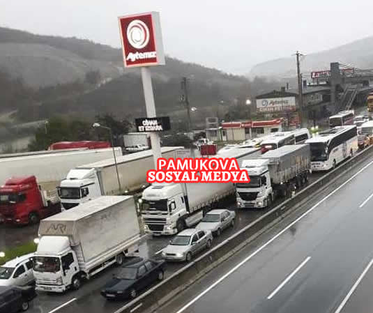 Kaza sonrası trafiğin ulaşıma kapanmasıyla uzun kuyruklar oluştu.Otomobillerin akaryakıt istasyonlarında beklediği görülürken yan yolları bilen araç sahiplerinin o yolları kullandığı görüldü.