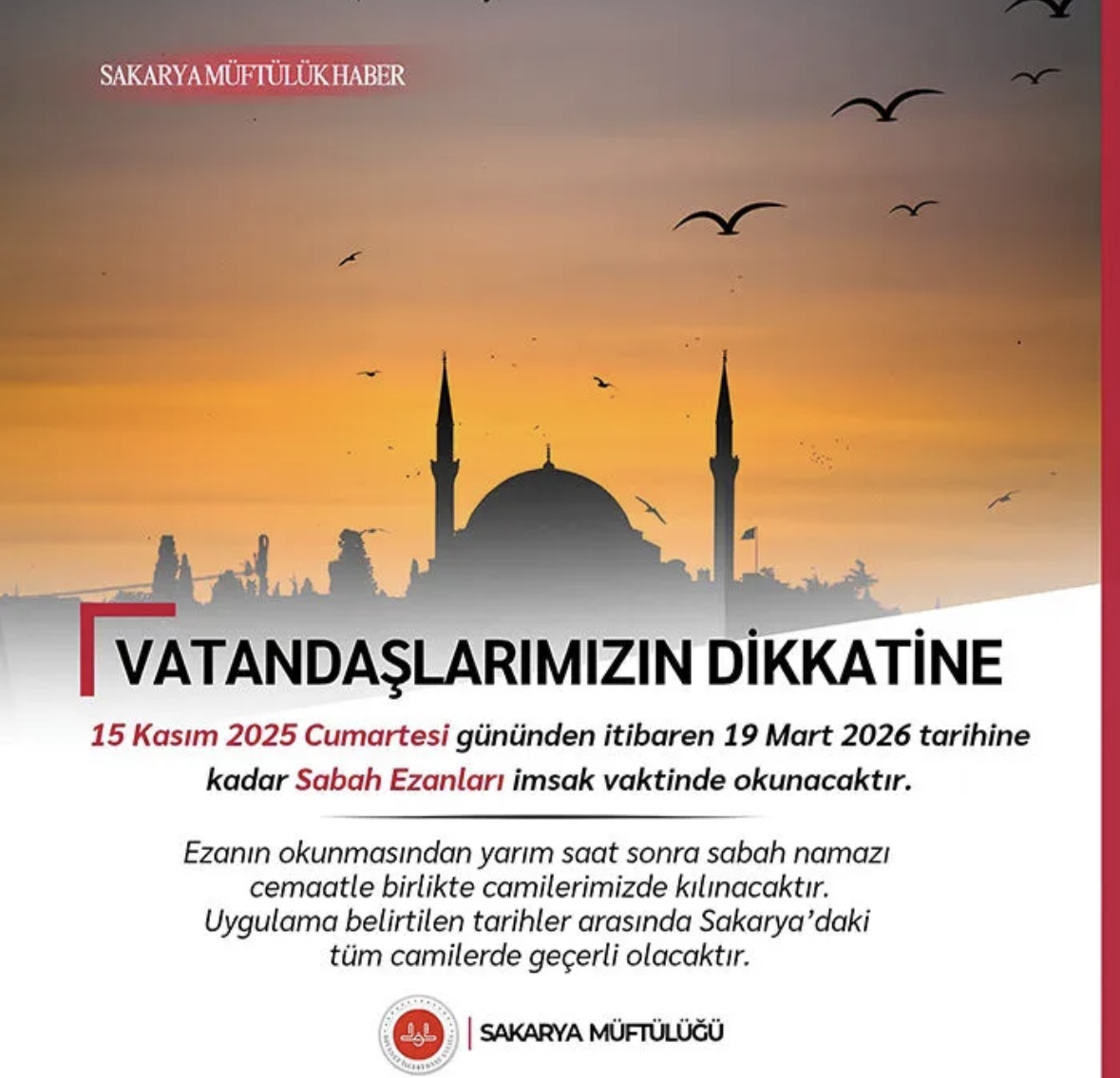 “15 Kasım 2025 – 19 Mart 2026 tarihleri arasında sabah ezanları imsak vaktinde okunacaktır. Ezanın ardından yarım saat sonra sabah namazı cemaatle kılınacaktır.”