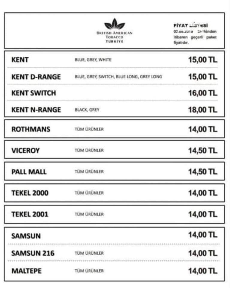 British American Tobacco tarafından paylaşılan bilgilere göre sigara fiyatları 3 Ağustos 2019 tarihinden itibaren geçerli olacaktır.